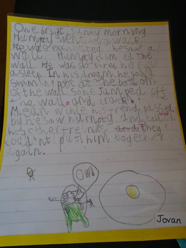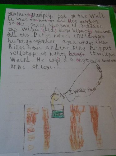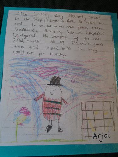 After learning the rhyme “Humpty Dumpty”, we wondered why Humpty was on the wall to begin with. This led to some very interesting discussions in class. The children then used these ideas to write a story to solve this puzzle.