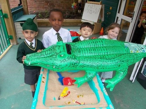 In this respect we believe that immersing the children in exciting topics is key; currently the Transition classroom has been transformed into the seaside and ‘treasure island’ complete with gold coins buried in sand, themed water play and even a blow-up crocodile. When I have been with the Transition children this term they have always displayed eagerness to show me how many gold coins they have counted in the treasure chest, vocabulary they can recognise, how the boats float in water, or how they are classifying materials such as shells and treasure. I have had many ‘delicious flavoured ice-creams’ made for me in the ‘Ice-cream Parlour’ role play area where the children have learned numerous number concepts using mathematical language.