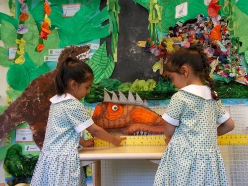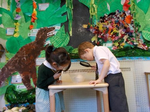 The Reception children have created displays which transports you to a dinosaur swamp environment millions of years ago with an erupting volcano, enormous hatching dinosaur eggs, swooping pterodactyls above our heads and of course a terrifying Tyrannosaurus Rex to scare any visitor to our classroom. The children amaze me with their thirst for knowledge, research and enthusiasm for paleontology, natural history and science which has been stimulated by the topic.